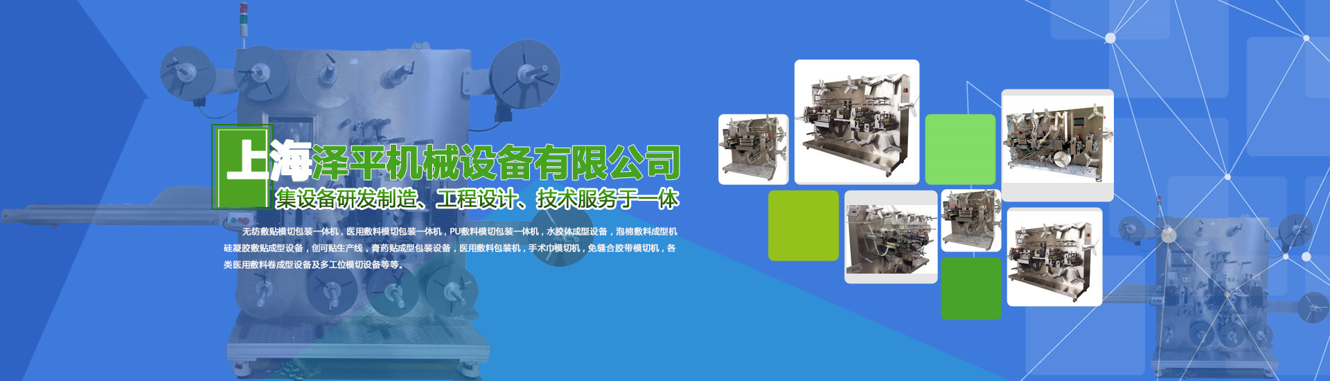 无纺敷贴模切包装一体机,医用敷料模切包装一体机,PU敷料模切包装一体机,水胶体成型设备,泡棉敷料成型机,硅凝胶敷贴成型设备,创可贴生产线,膏药贴成型包装设备,医用敷料包装机,手术巾模切机,免缝合胶带模切机,各类医用敷料卷成型设备及多工位模切设备等等。